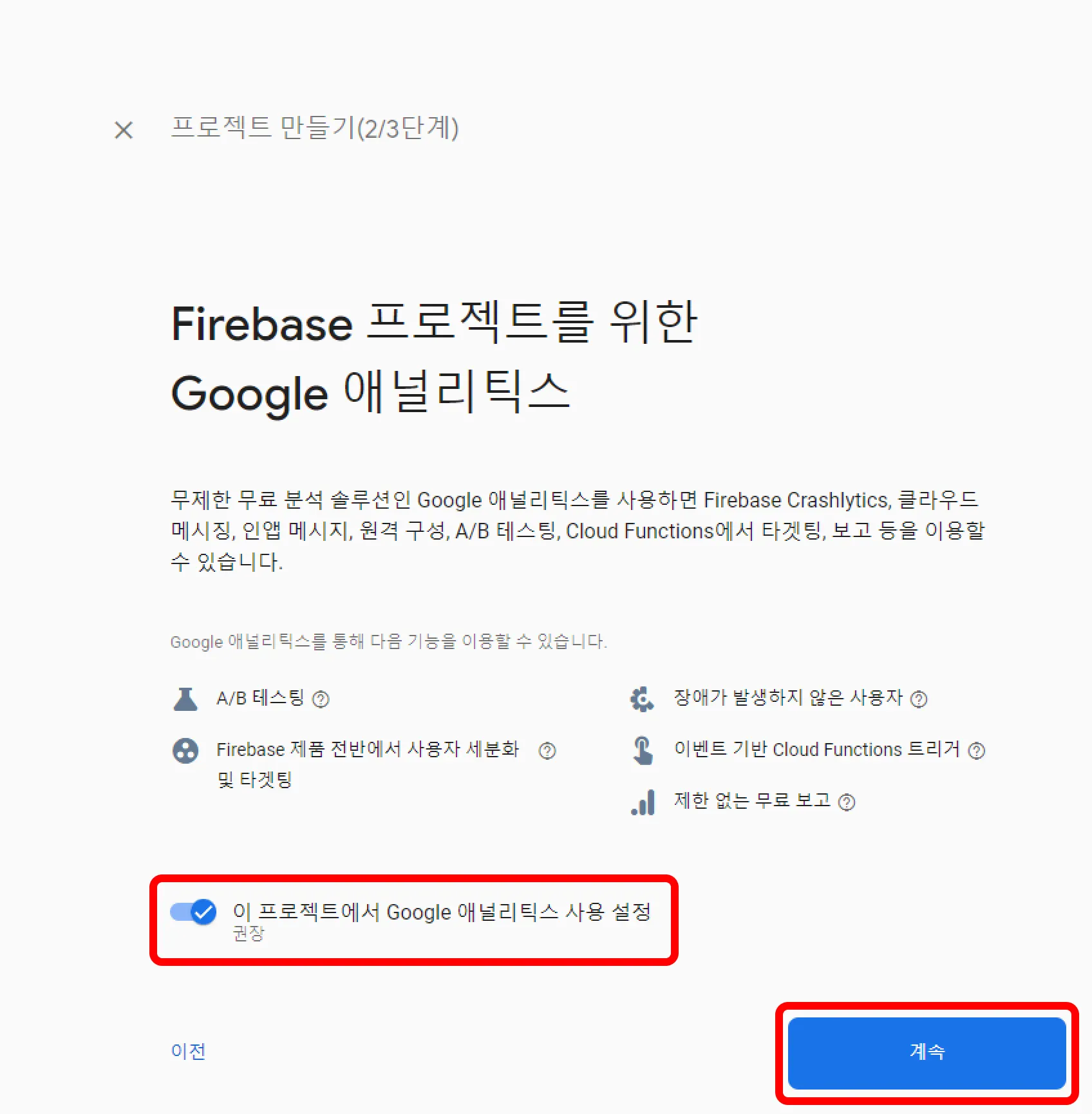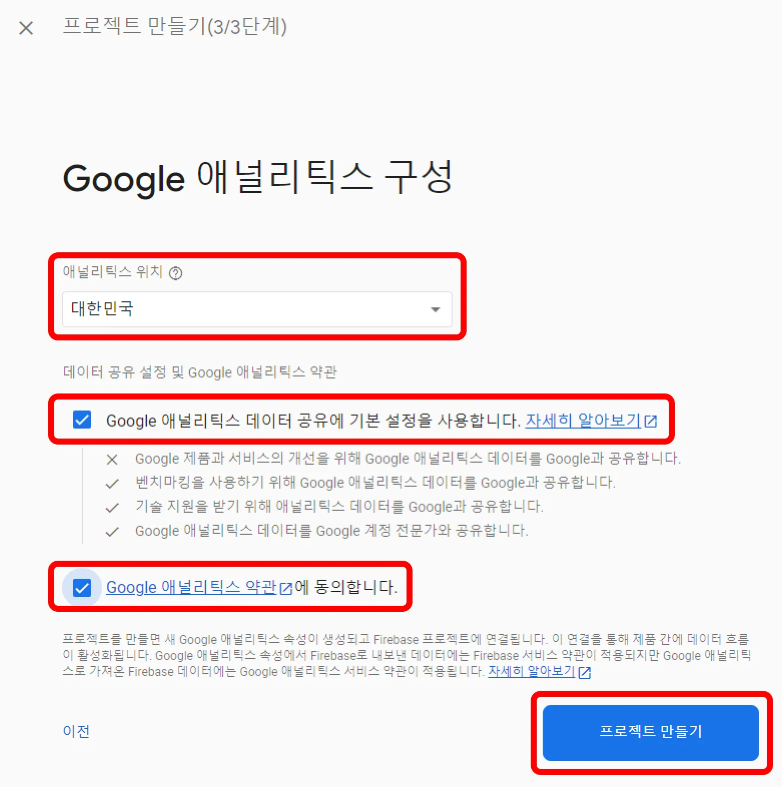 Google 애널리틱스 위치를 선택하고, 약관에 동의한 후 프로젝트 만들기 를 선택합니다.