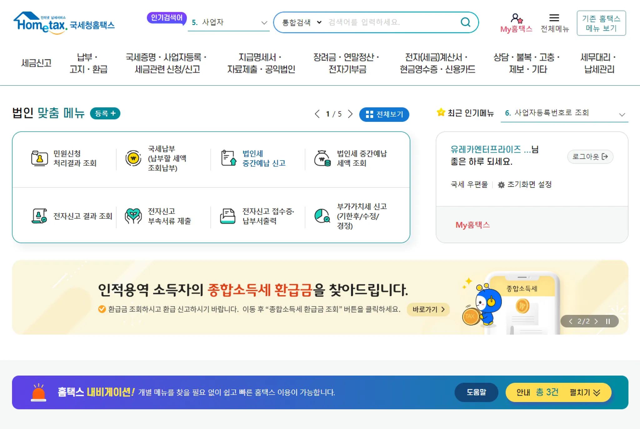 본 문서는 홈택스에 정상적으로 로그인되어 있다는 가정 하에 안내합니다.