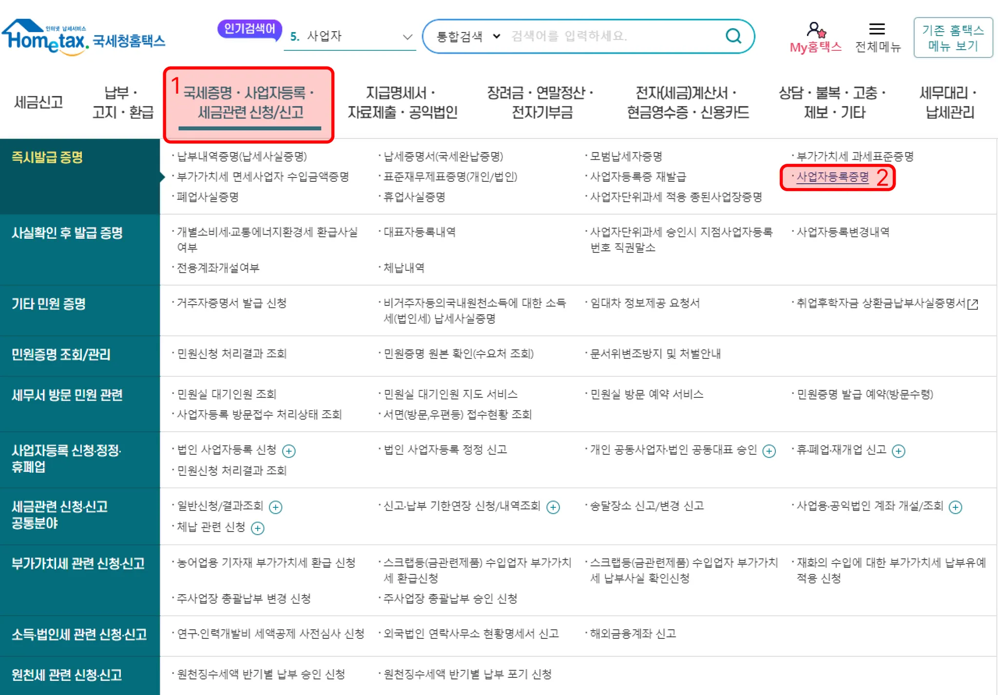 2. 사업자등록증명 메뉴 접속하기