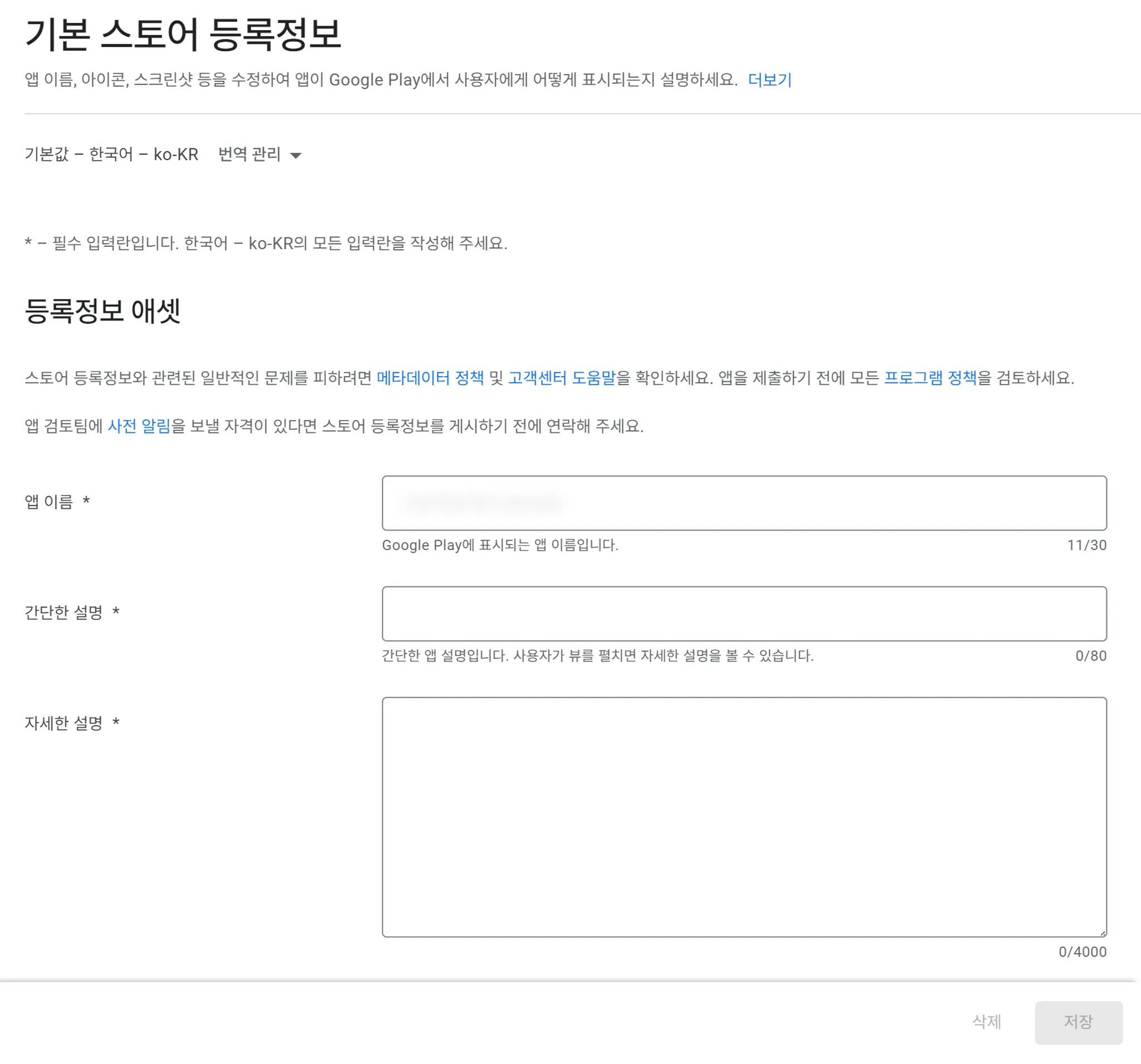 앱에 대한 기본 정보를 모두 제공하였다면, 이제 기본 스토어 등록정보를 입력할 차례입니다.