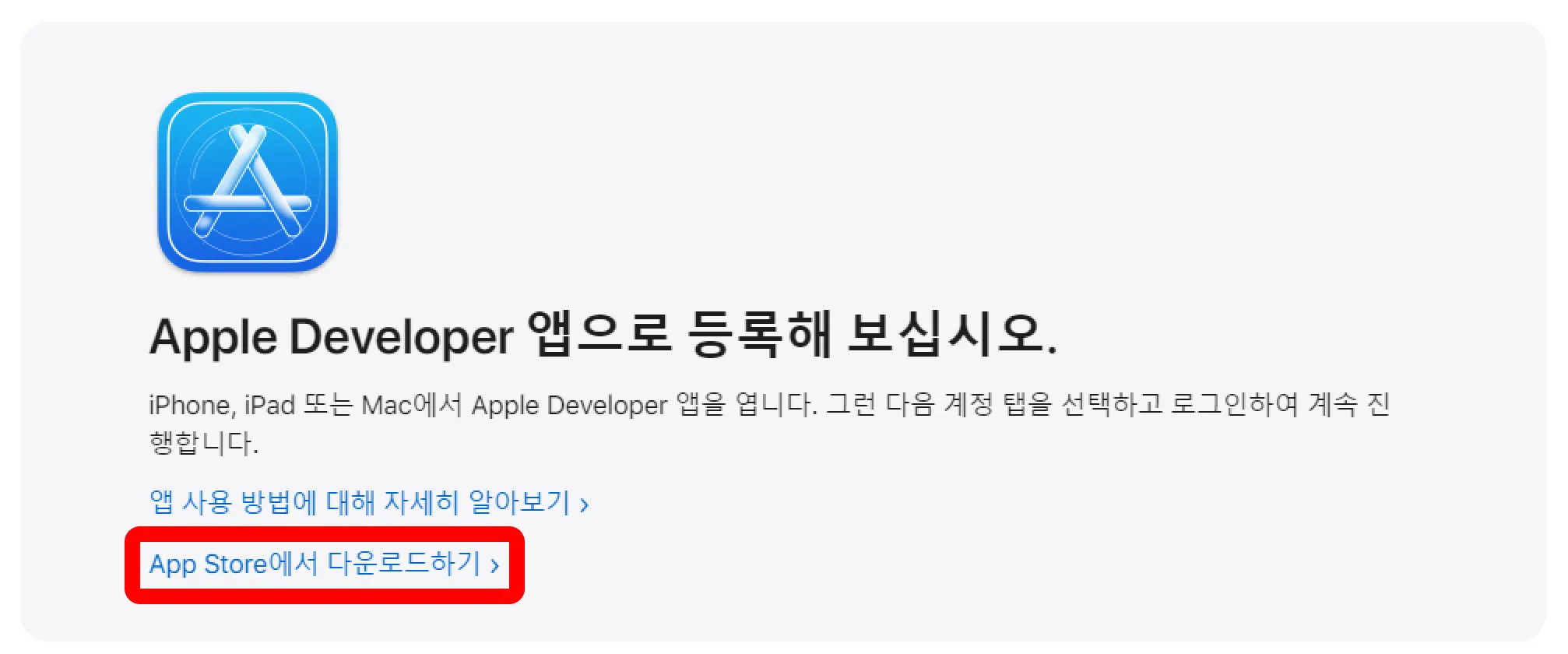 Apple Developer 앱 관련 안내가 나오면, App Store에서 다운로드하기 버튼을 클릭합니다.
