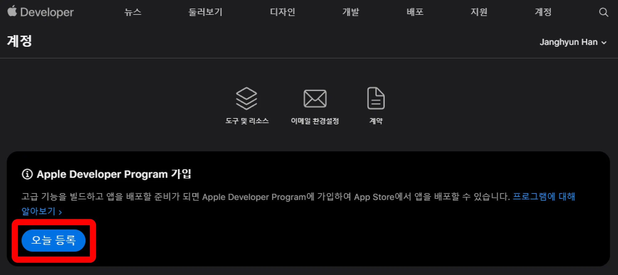 Apple Developer Program 가입 섹션에서 오늘 등록 버튼을 클릭합니다.