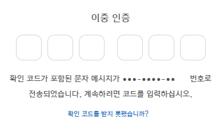 이중 인증 창이 뜨면, 회원가입 시 입력한 연락처로 발송된 이중 인증 번호를 확인 후 입력합니다.