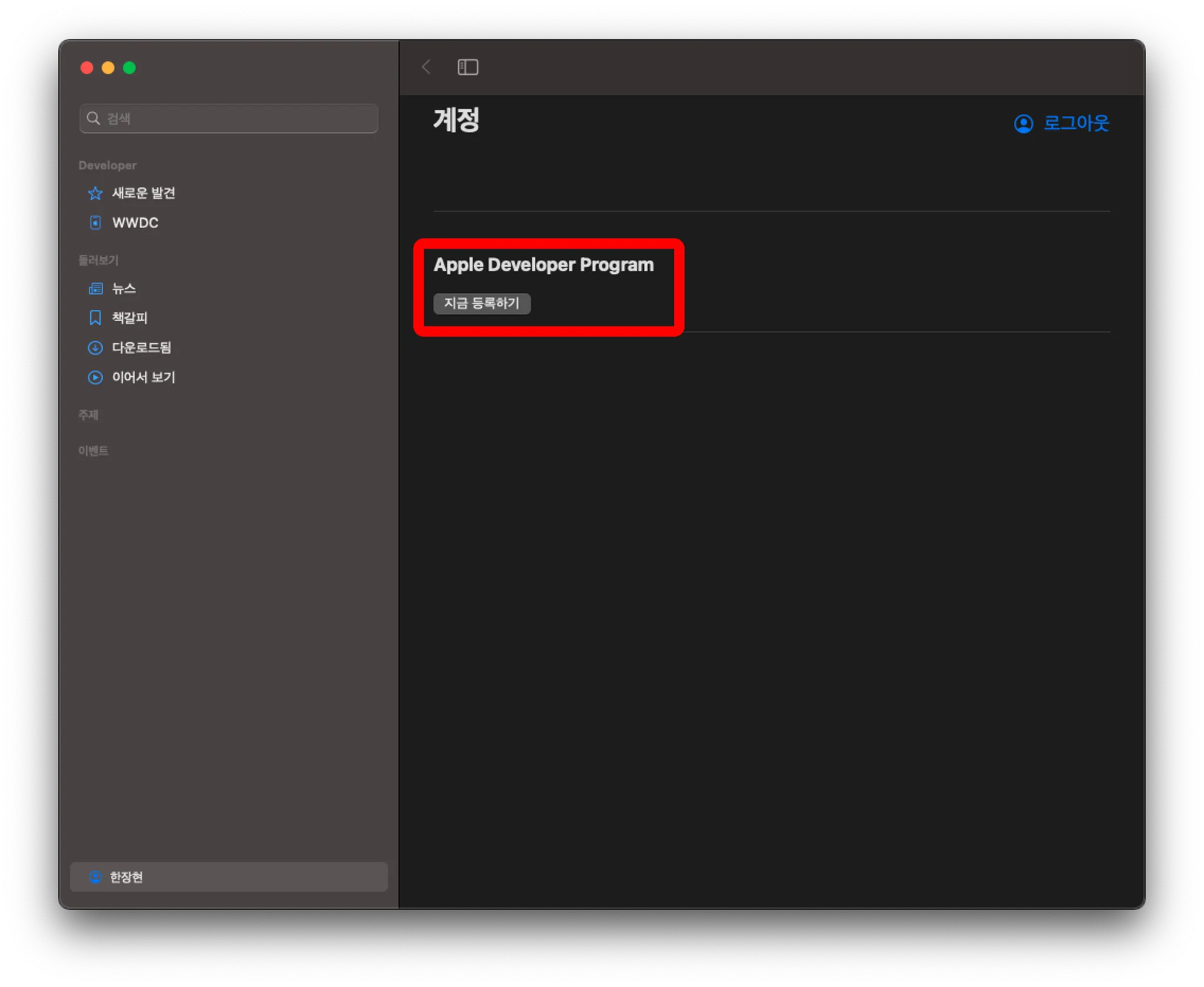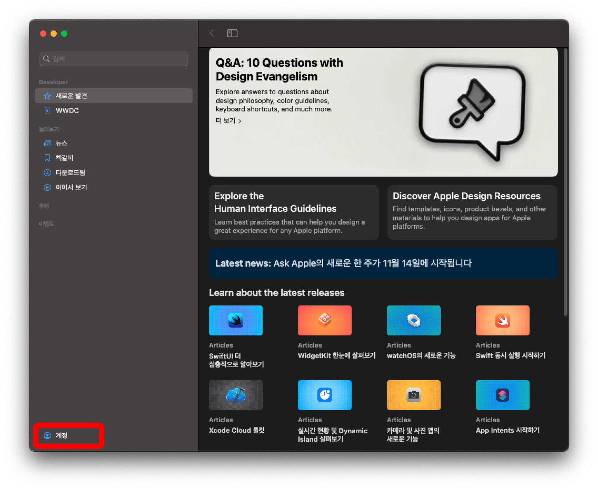 설치된 Apple Developer 앱을 실행하고, 좌측 하단의 계정 메뉴를 클릭합니다.
