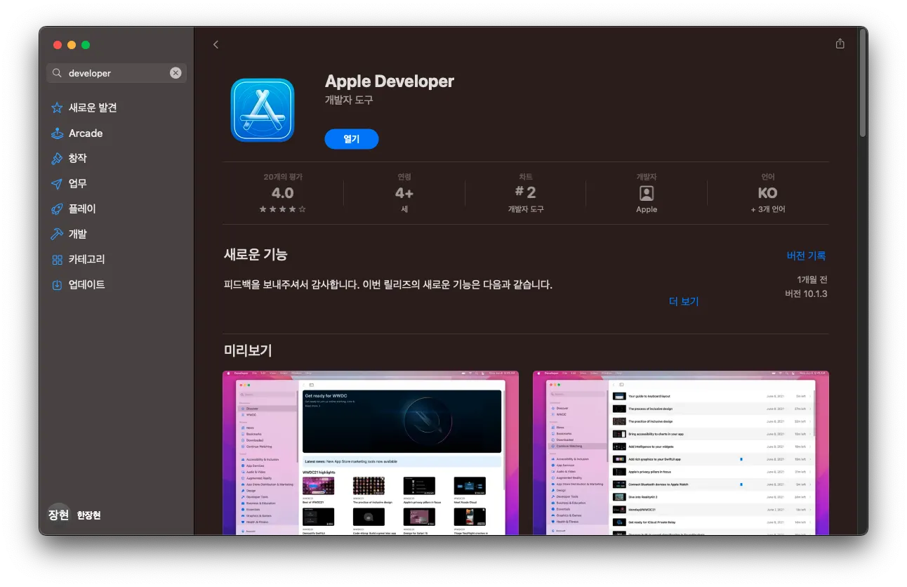 Mac 환경에서 App Store 로 이동하여, Apple Developer 앱을 설치합니다.