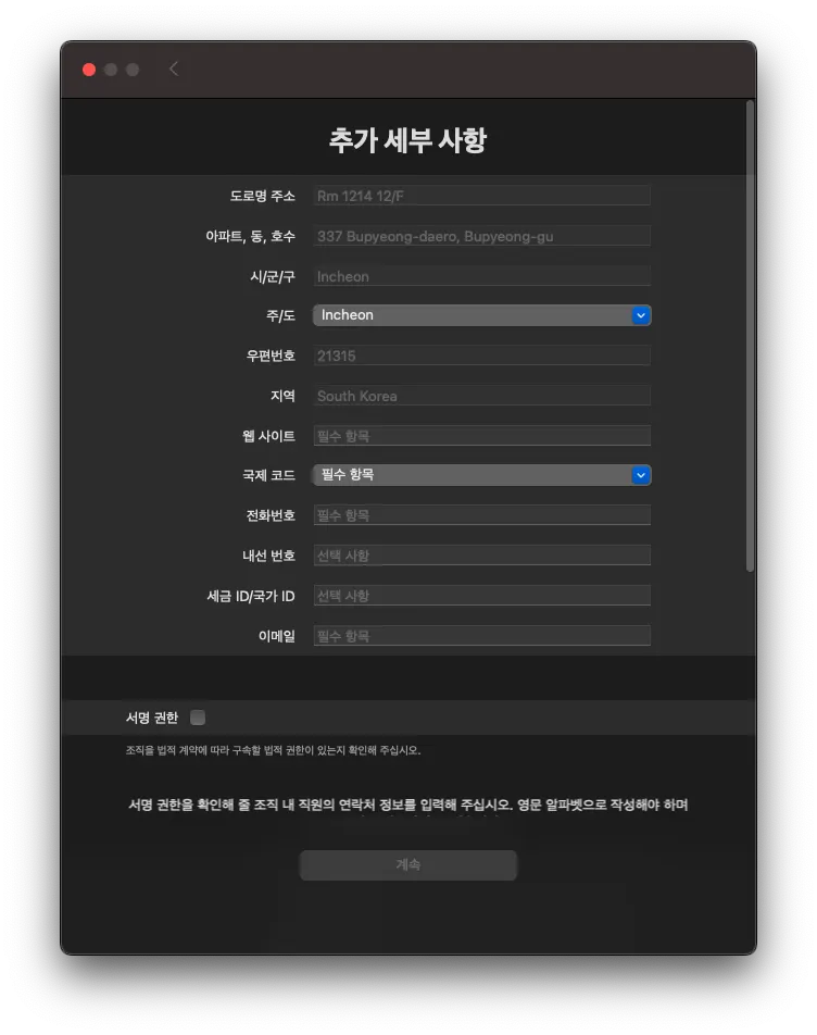 Apple Developer Program 가입에 필요한 추가 정보를 정확히 입력합니다.